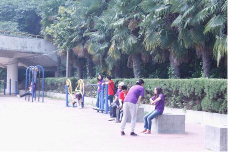 午间休息,体育学院的健身设施成了大家休闲的好去处