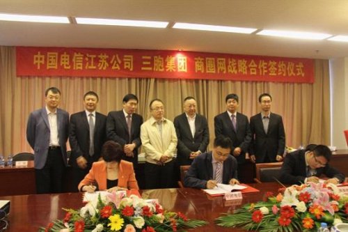 中国电信江苏分公司总经理高同庆、三胞集团董事长袁亚非、商圈网首席执行官王晔出席了本次签约。仪式上,三方签订战略合作协议,建立战略、全面、长期的合作关系,在通信服务与系统集成、业务融合与渠道合作、客户服务与协同支撑等领域进行深入合作。