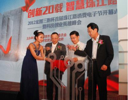 9月29日上午,2012“宏图三胞”杯首届珠江路消费电子节在南京维景国际大酒店二楼宴会厅隆重开幕。中国电子商会、省、市、区领导以及国内外知名IT厂商代表,徐庄、珠江路的IT企业嘉宾等100多人应邀出席。玄武区区委书记储永宏,中国电子商会常务副会长王宁,江苏省工商联副主席、珠江路商会会长、三胞集团董事长袁亚非共同点亮珠江路20年。